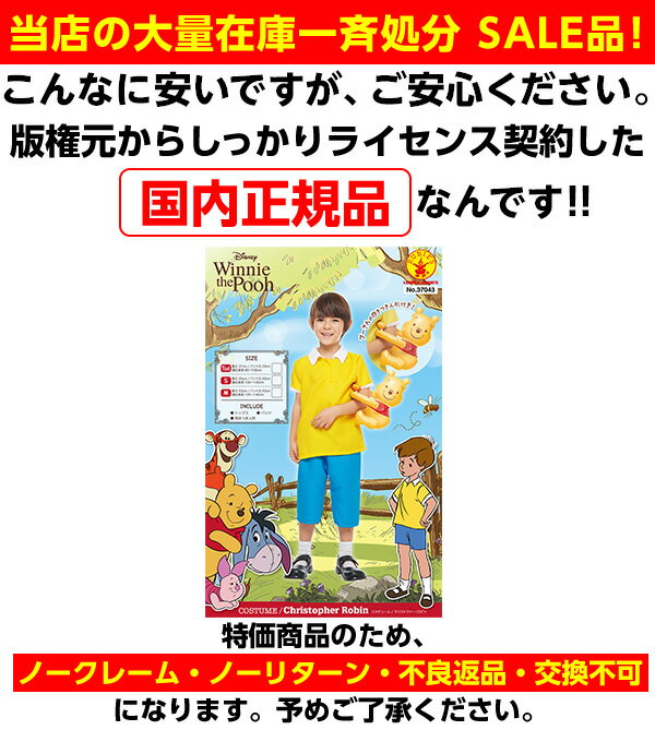 大人気キャラクターのコスチュームセットがメーカー希望小売価格 合計5990円(6589円税込)のところ…↓なんと、 売価 1200円(1320円税込)に!!37043 クリストファー・ロビン S 1個メーカー希望小売価格5990円(6589円税込)サイズトップス着丈 45cm/パンツ丈 43cm適応身長:100〜120cmセット内容トップス/パンツ/プーさんの抱きつき人形※靴、靴下はセット内容に含まれません。